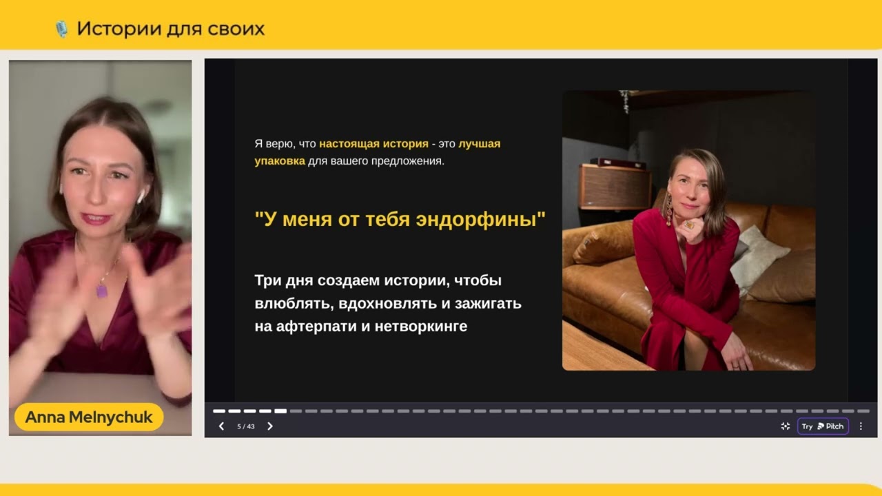 Вы получаете записи и презентации всех вебинаров школы, чат с Анной Мельничук, мастер-маинд с разбором историй, маркетингового позиционирования и публичных выступлений.
